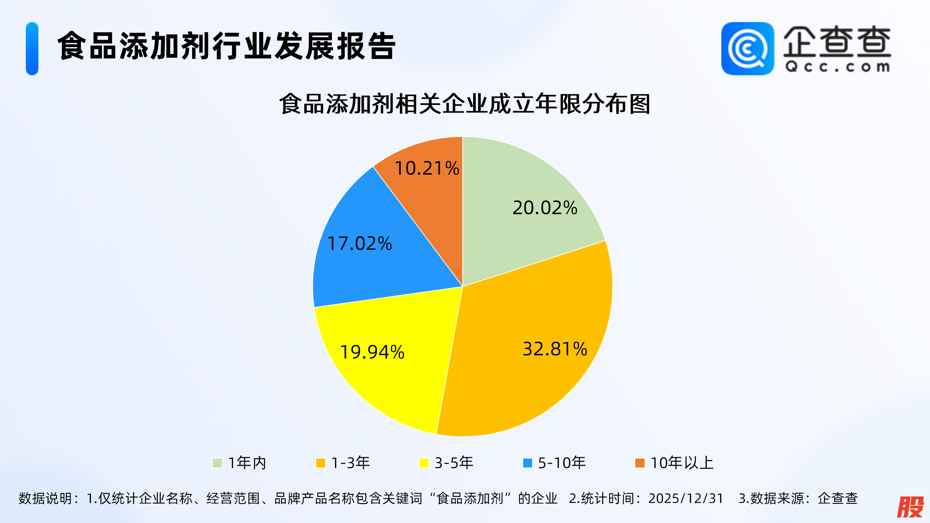 企查查数据显示,截至2025年12月31日,国内现存食品添加剂相关企业69.98万家。近十年相关企业注册量呈整体增长态势,其中2023年全年注册16.13万家相关企业,同比增长51.91%,达近十年注册量峰值。2025年全年注册14.74万家食品添加剂相关企业,同比增长6.28%。2.相关企业主要成立于近三年