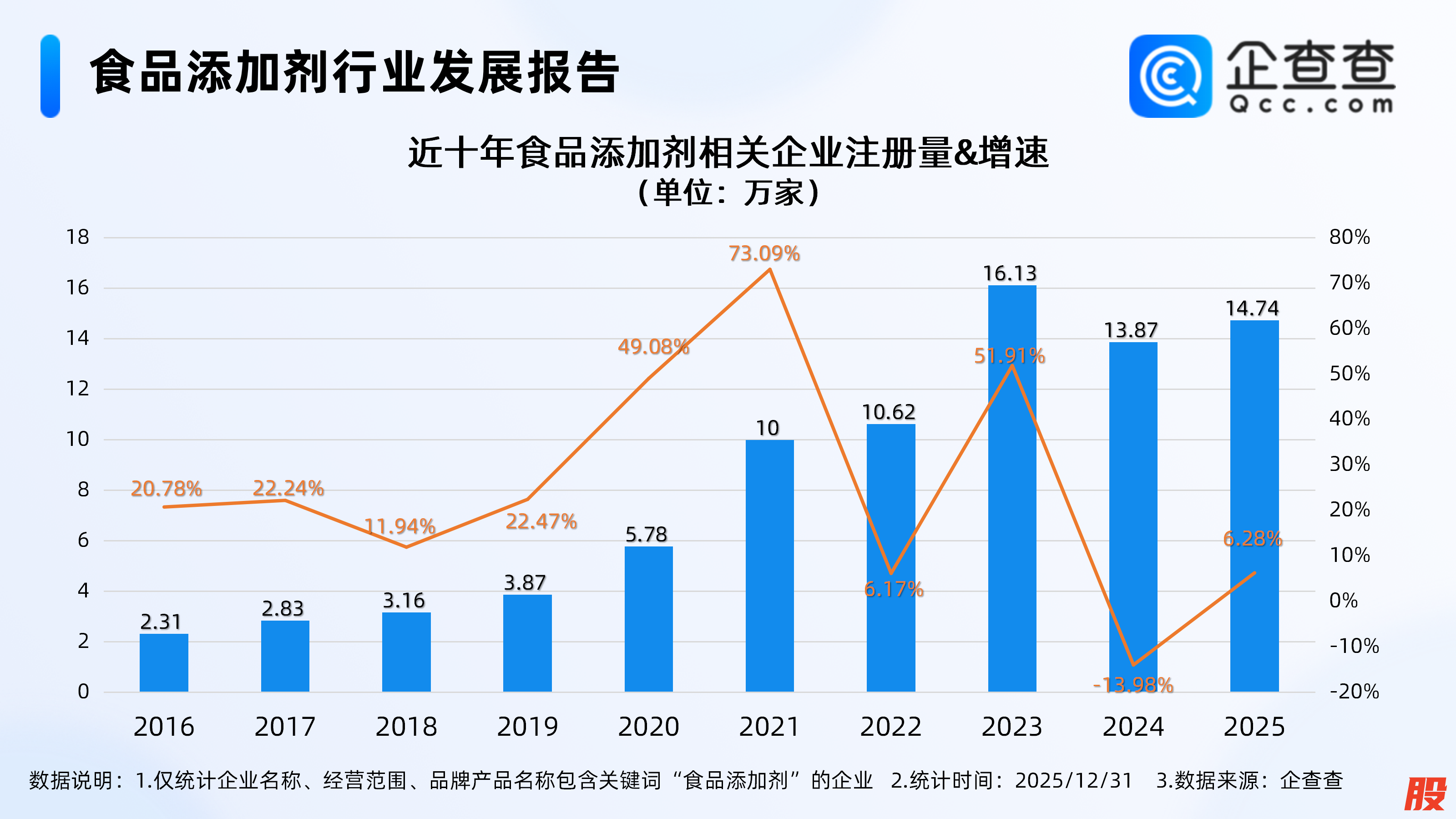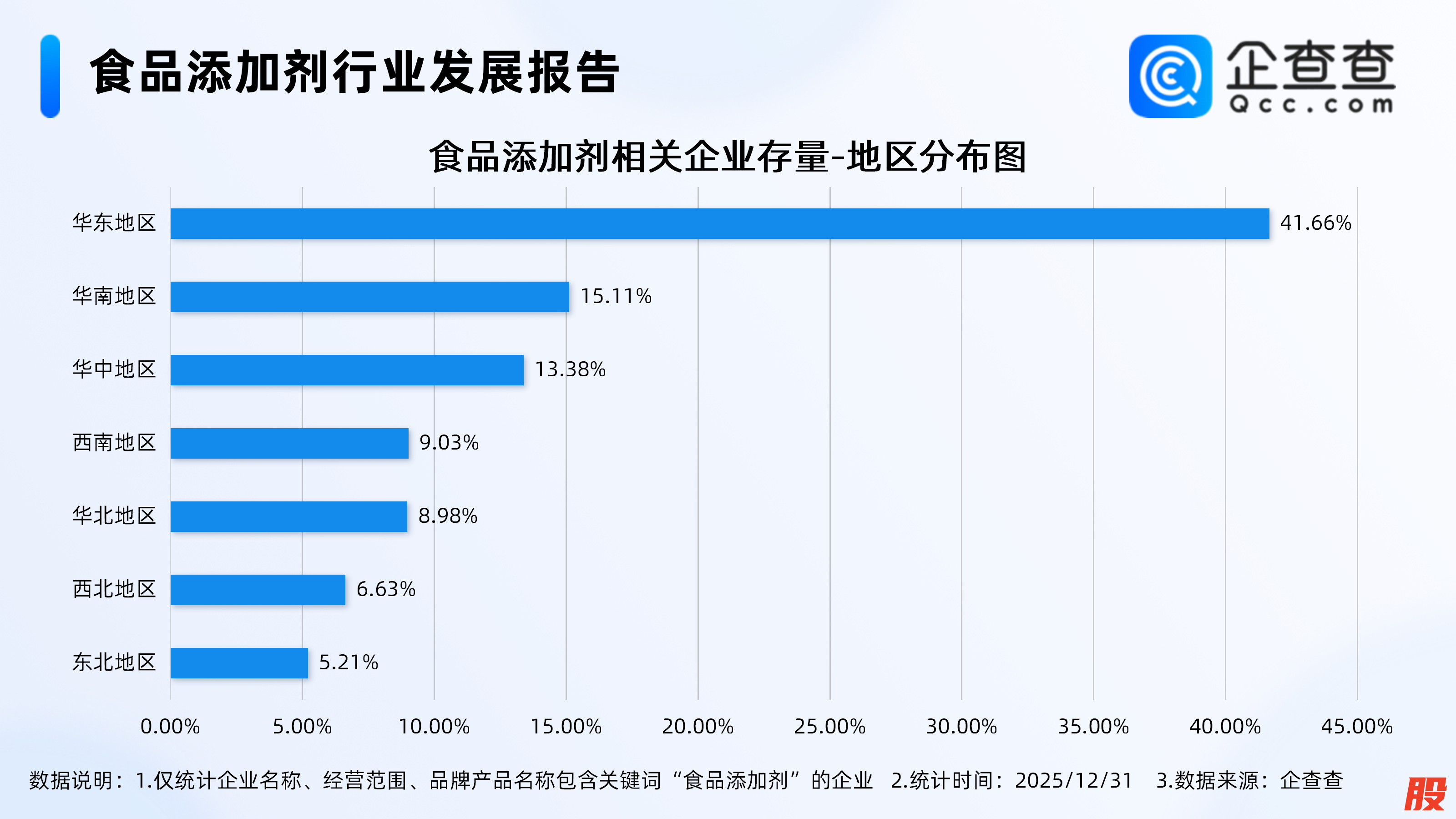 近日,市场监管总局正式发布《食品添加剂生产许可审查细则(2025版)》(以下简称《细则》),进一步加强对食品添加剂生产的全链条监管。《细则》自发布之日起施行,将作为食品添加剂企业申请生产许可的重要审查依据,与《食品生产许可审查通则》配套使用。企查查数据显示,截至2025年12月31日,国内现存食品添加剂相关企业69.98万家。注册量方面,近十年相关企业注册量呈整体增长态势,2025年全年注册14.74万家食品添加剂相关企业,同比增长6.28%。存量方面,从经营时间来看,食品添加剂相关企业主要成立于近三年,成立年限在1-3年的相关企业占比32.81%。从地区分布来看,食品添加剂相关企业主要集中分布在华东地区,占比高达41.66%。1.现存食品添加剂相关企业69.98万家